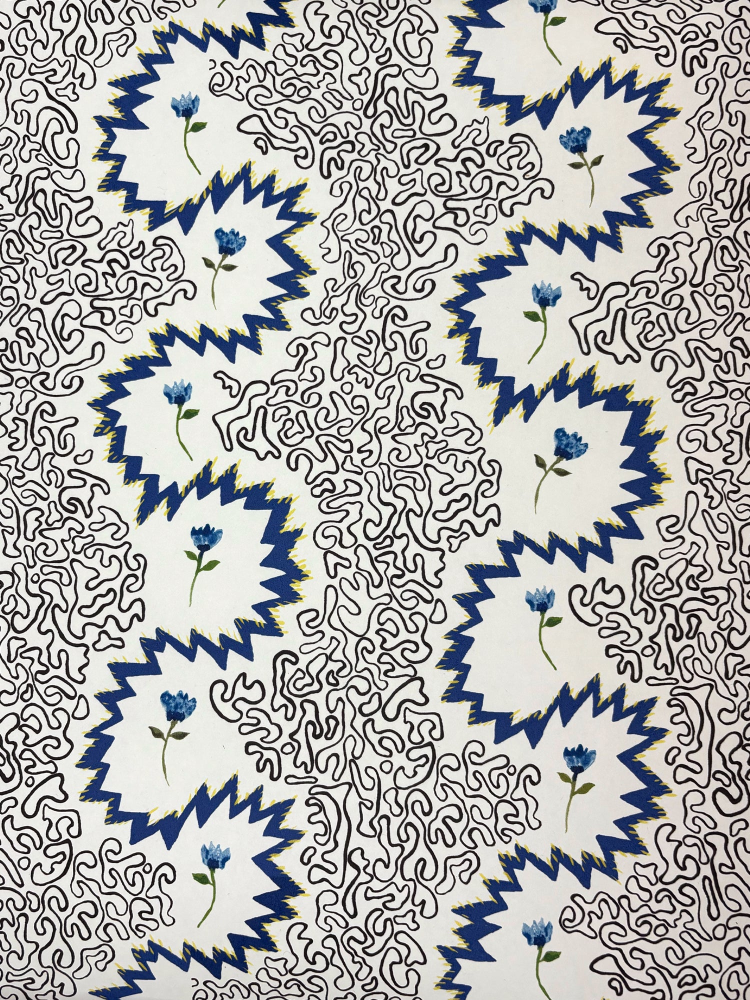A study in contrast and balance, Floral Zigzag in Slate Blue brings together the geometry of sharp, rhythmic angles with the softness of organic coral and floral forms. The result is a design that feels dynamic yet serene, with every line and curve working in quiet harmony.
